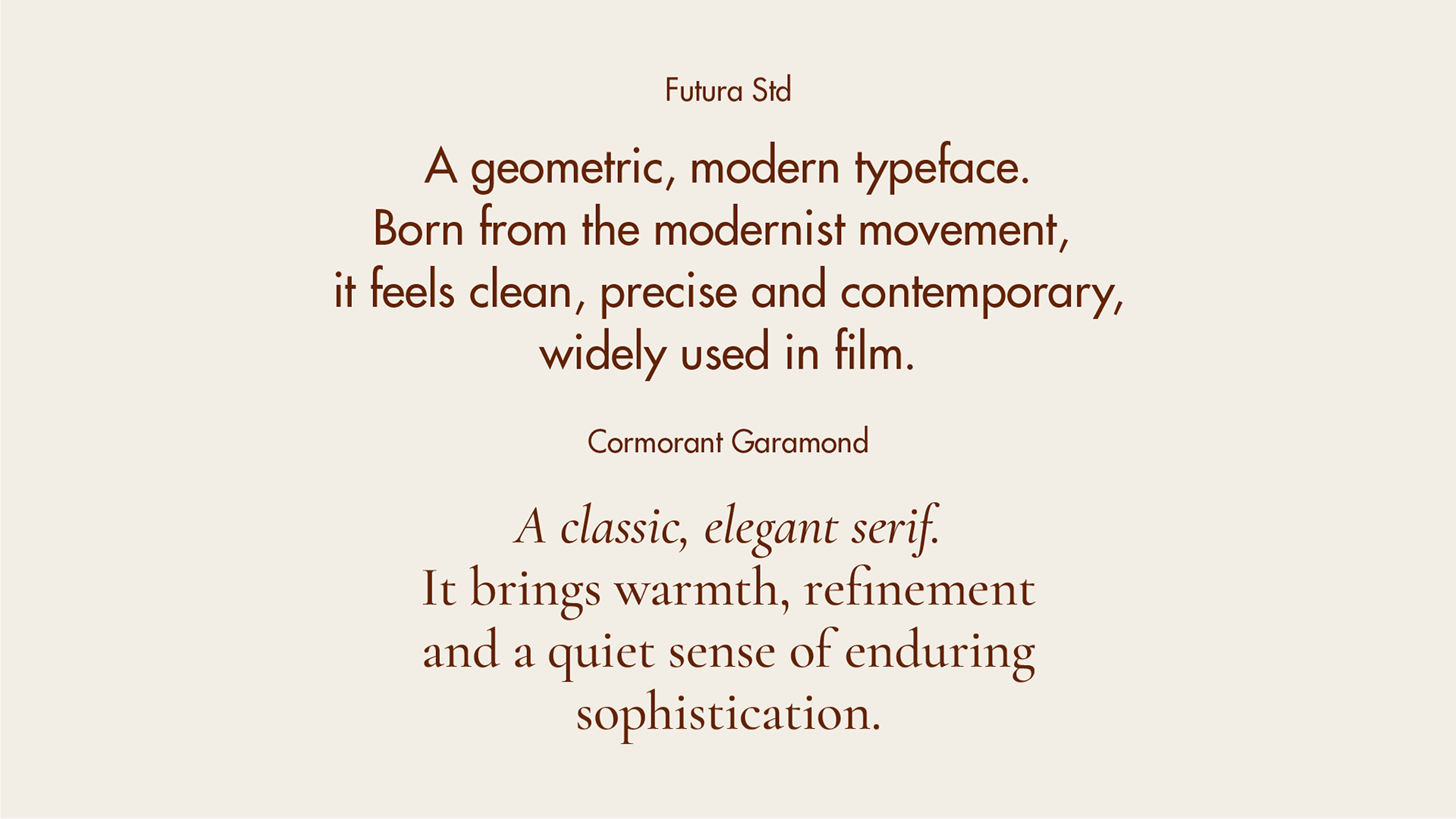 Typography pairs Futura Std (geometric, modern, precise) with Cormorant Garamond (classic, warm, refined).