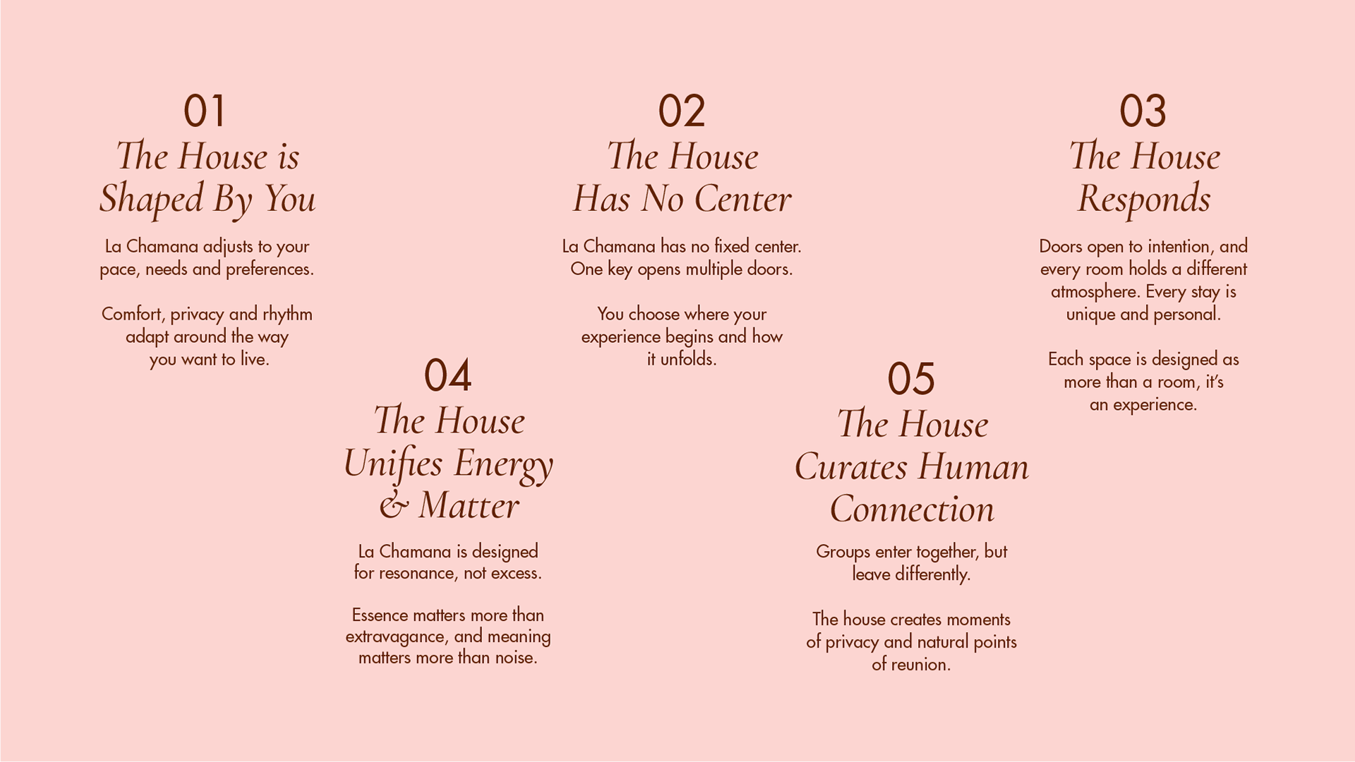 Tulum’s luxury hospitality market is over-saturated with properties competing on amenities, interiors, and location. The visual language across the category has converged into a generic aesthetic of excess. La Chamana needed to stand apart, not by being louder, but by being more intentional. The property’s name carries spiritual connotations. Its architecture is dramatic and singular. But without a clear brand framework, the risk was becoming another beautiful space without a distinct proposition.
