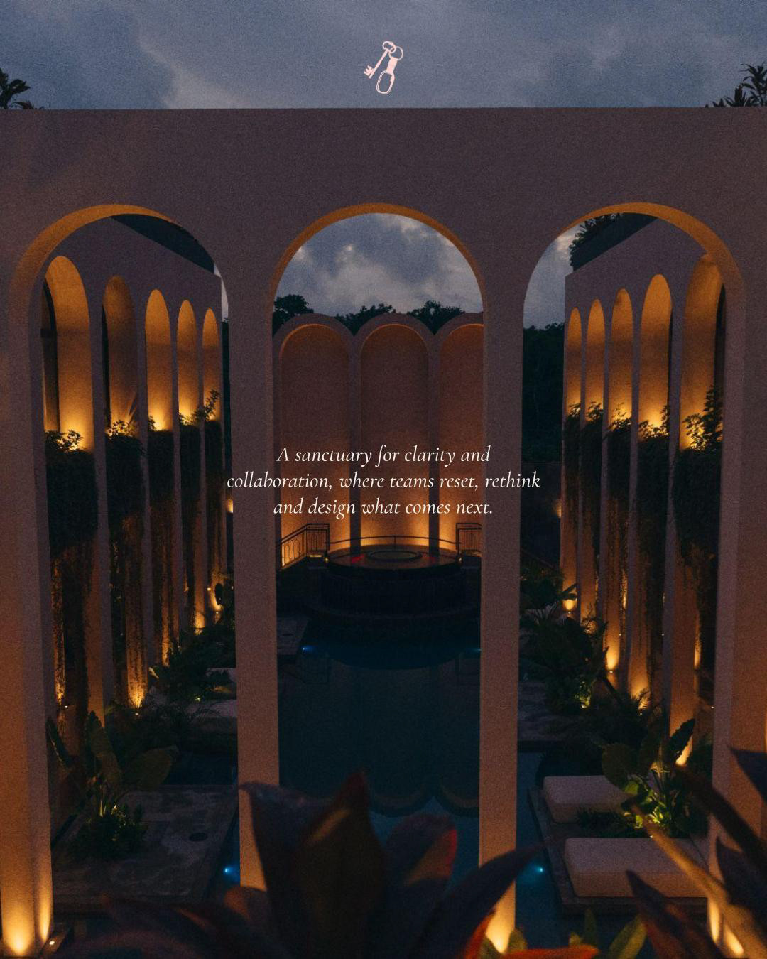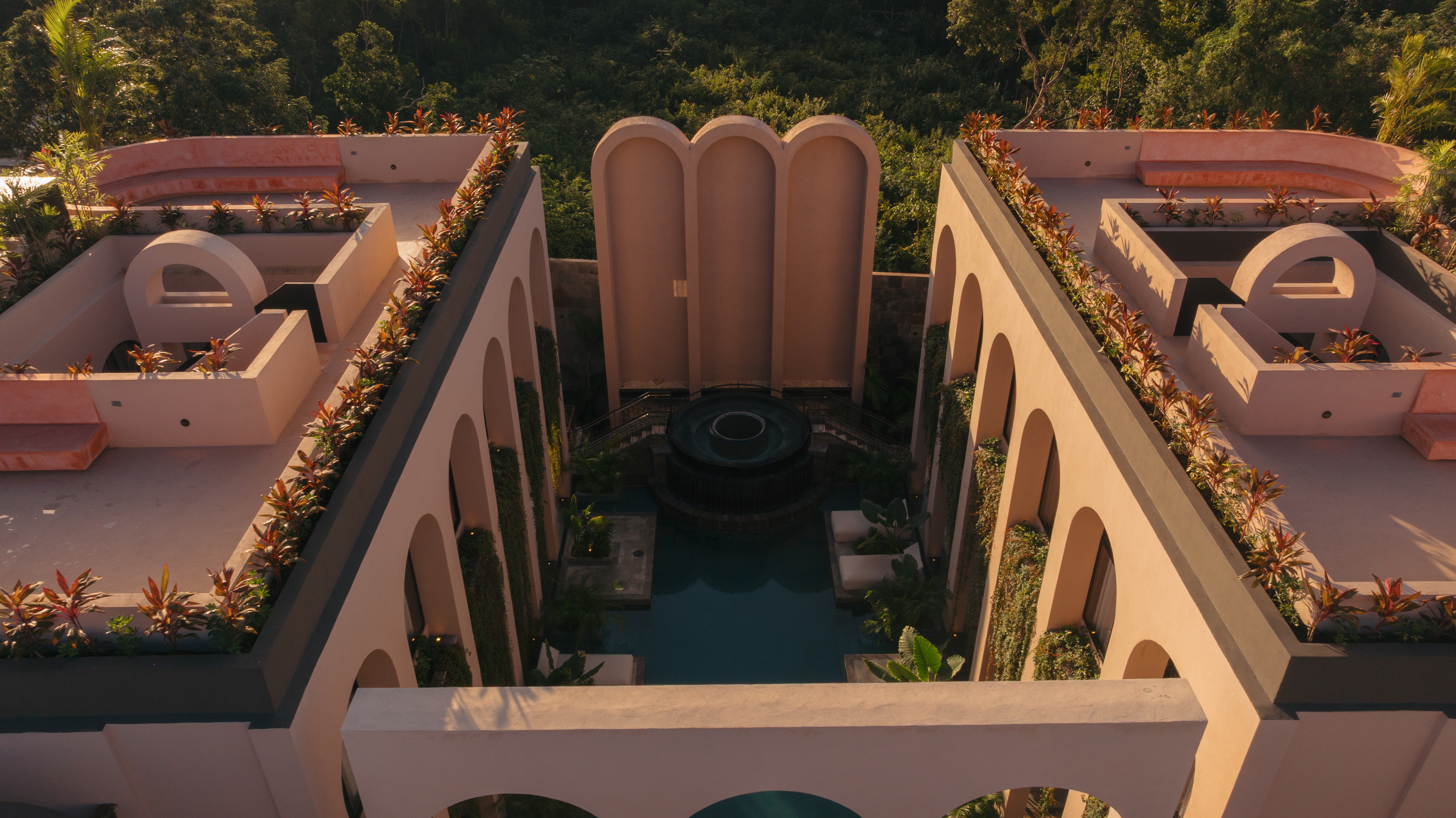 The property includes a Temazcal, Mirror Temple, Pensatorium, Theatre, Library, Spa, Gym, and a private beach club on the Riviera Maya coast.